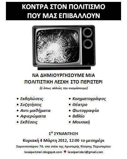 Με το καλό. Καλό Ξεκίνημα, κι ας μην είμαστε κοντά σας... Θέλουμε έναν πολιτισμό μακριά από τη μιζέρια του τηλεοπτικού βόθρου. Αν μπορούμε να κάνουμε κάτι εξ αποστάσεως, μας καλείτε.